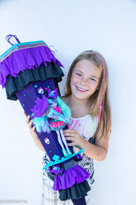 Ik liet de Schultüte door een vriendin maken in de stijl van haar rugzak. Ik kon mijn ogen niet geloven toen ze hem kwam brengen. Ze had zelfs een pop van Monster High gekocht. De Tüte wordt normaal gevuld met wat kleine cadeautjes en snoep. Eva had nog nieuwe sloffen nodig voor school, dus toog ik naar de winkel en kocht ik sloffen, een nieuwe lunchbox, een sleutelhanger en enorm potlood en een zak met marshmallows. Niet te gek, maar toch wat leuke cadeautjes.